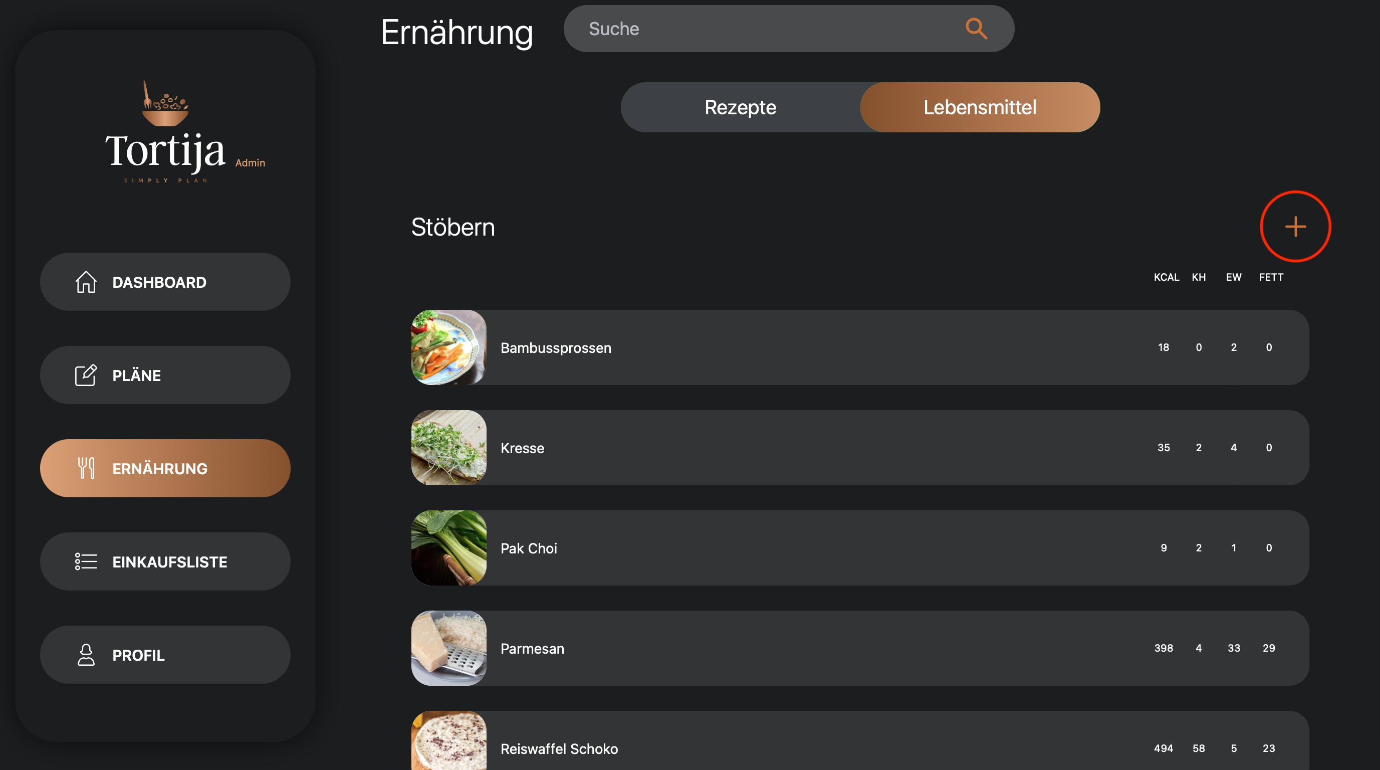 Um ein neues Lebensmittel anzulegen wählst du im Menü den Reiter „Ernährung“ / „Lebensmittel“ und anschließend das „+“ über den Lebensmitteln.