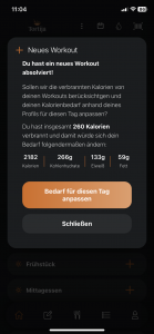 Du kannst dann entscheiden, ob du diese verbrannten Kalorien zu deinem täglichen Bedarf dazurechnen möchtest. Der Bedarf wird dann neu berechnet.